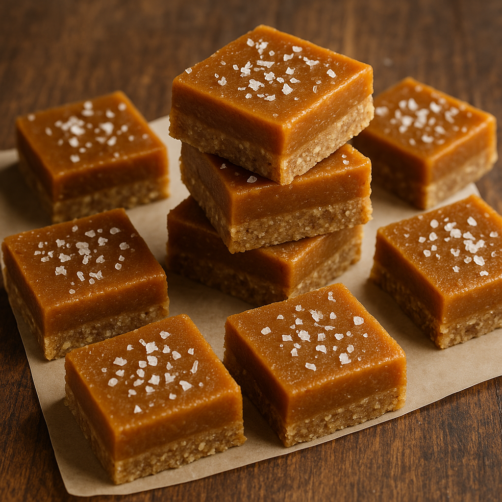 Just a buttery nut crust layered with sticky, golden caramel made from coconut cream and dates, finished with a sprinkle of flaky sea salt.